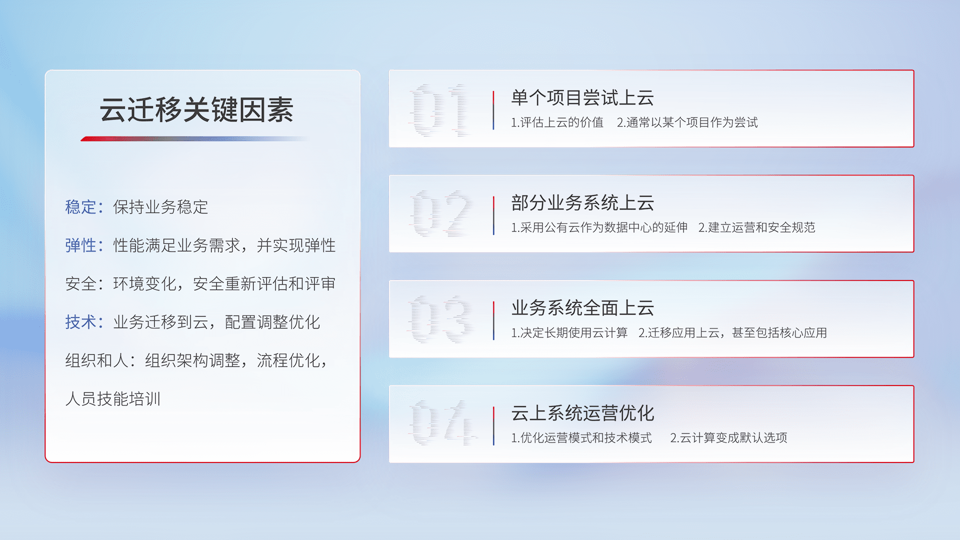 结合实际业务,,从规划设计、、云平台选型、、、云原生改造、、数据迁移、、、、集成交付,,,,迁移全过程为客户识别最佳上云路径,,,,做好风险识别管理,,,,设计网络架构、、、、身份权限、、、安全审计合规、、、操作审计、、、日志审计、、监控告警策略、、、多站点容灾设计等,,对云上基础设施进行整体规划,,,,提升IT治理水平,,以满足弹性、、高可用、、、高性能的需求。。。