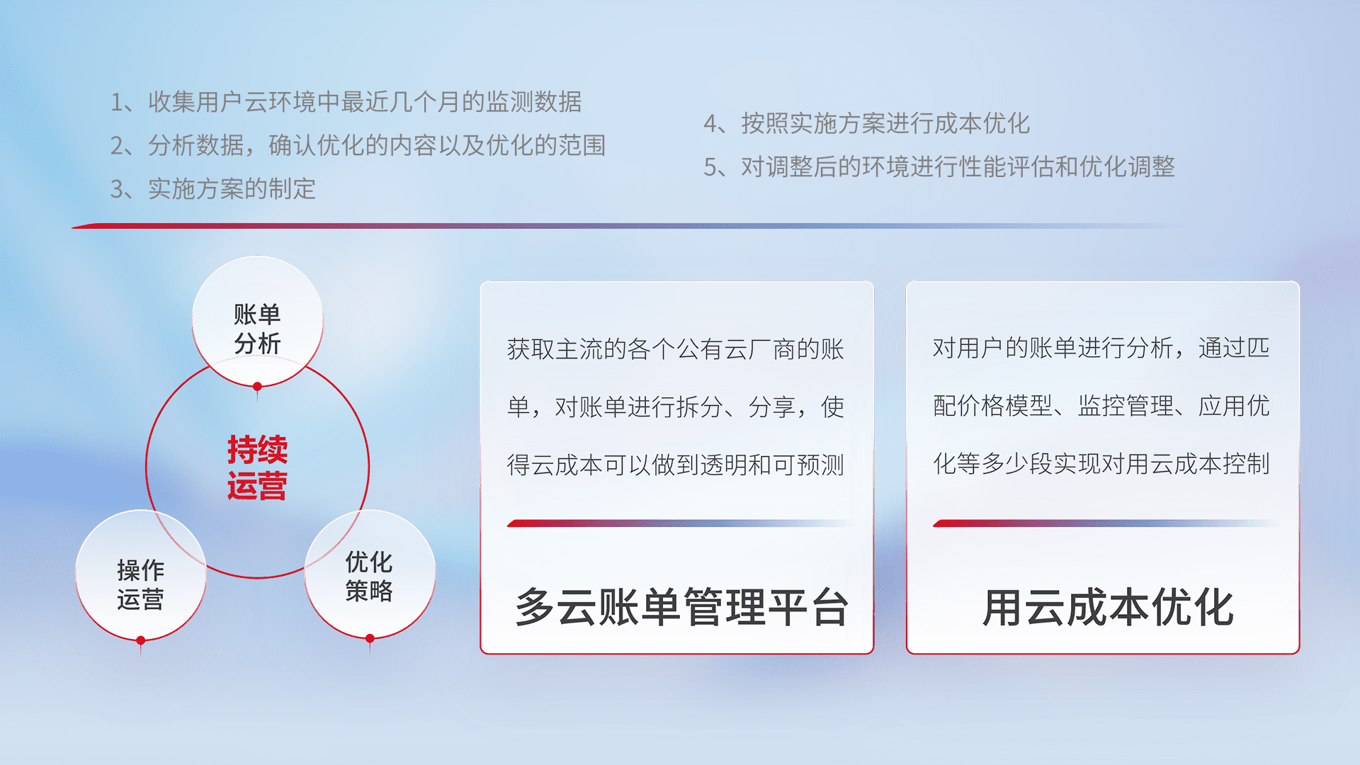 通过多云纳管,,以统一的资源数据模型把客户的云资源进行抽象和封装,,进而实现对多云资源的统一操作,,,保障云资源管理的可靠性、、稳定性与可用性。。。量身定制化运维内容,,,,配置、、、、开发运维、、补丁管理、、、备份、、、、监控、、认证和访问管理、、审计和日常巡检等,,,保障在用云过程中的可靠度,,稳定度以及高可用率。。